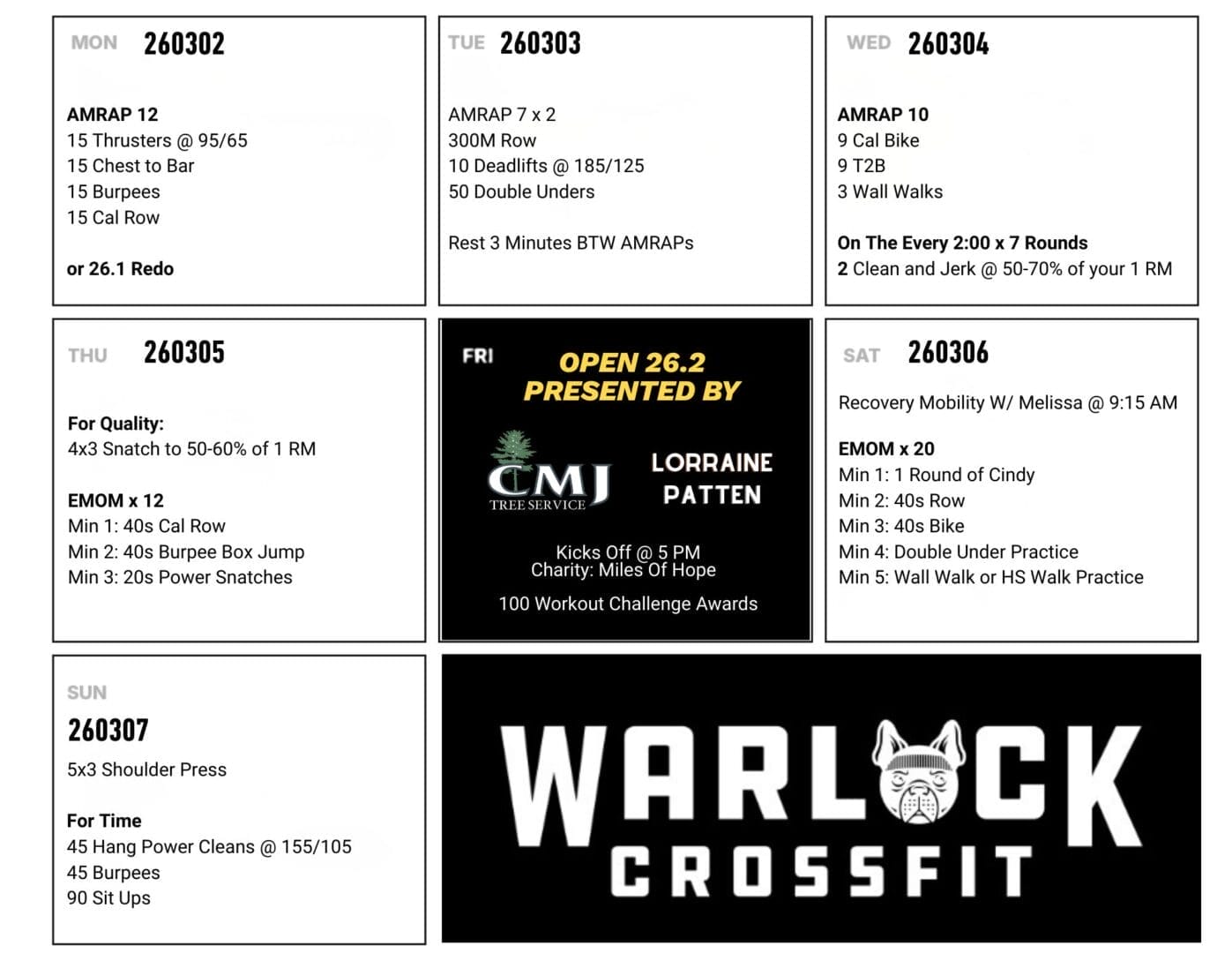 Friday: 26.2 at 5 PM. This Friday 26.2 is presented by CMJ Tree Service (Jim Cahill) and Lorraine Patten. With Hospitality provided by Jeanie Bean Deli! We will have DJ B.Mills in the house and Nicole Puckette capturing all the high fives and smiles along the way! Please rock your favorite Warlock gear!